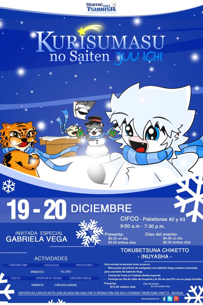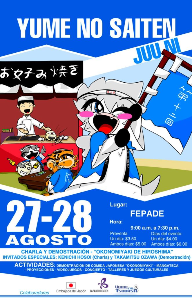 – YUME NO SAITEN YUU NI – Fecha: Sábado 27 y domingo 28 de agosto Lugar: FEPADE (frente a Centro Comercial la Gran Via y Centro Comercial Las Cascadas) Hora: 9:00 a.m. a 7:30 p.m. Preventa: Un día: $3.50 Ambos días: $5.00 Días del evento: Un día: $4.00 Ambos días: $6.00 CHARLA Y DEMOSTRACIÓN …