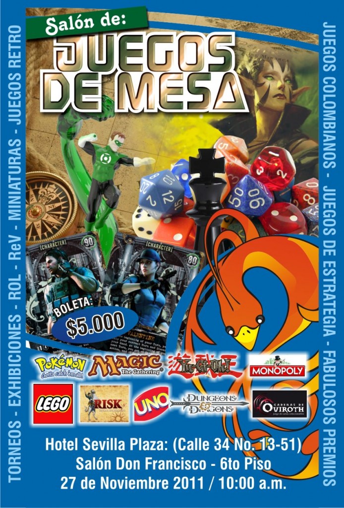 Sálon de: Juegos de mesa Hora Domingo, 27 de noviembre · 10:00 – 13:00 Lugar Hotel Sevilla Plaza: (Calle 34 No. 13-51) Salón Don Francisco – 6to Piso Torneos, Exhibiciones, Rol, ReV, Juegos Retro, Juegos Colombianos, Juegos de Estrategia, Fabulosos Premios Mayor Informacion: http://www.facebook.com/event.php?eid=158664787563811
