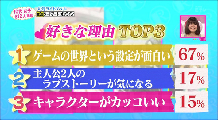 Es a través de la emisión del canal R no Housoku (NHK) que descubrimos la votación de las novelas ligeras más populares en 2014 según los adolescentes, en Japón. La encuesta fue realizada por 612 adolescentes japoneses para saber cual era su novela ligera favorita en 2014. Top 3 : 3.) Sword Art Online de Reki Kawahara 2.) Durarara!! de Ryohgo Narita 1.) Kagerous Days de Jin